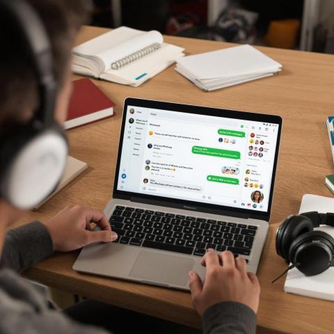 A creative depiction of WhatsApp Web being used for online learning, featuring chats with classmates and teachers in an academic setting.
