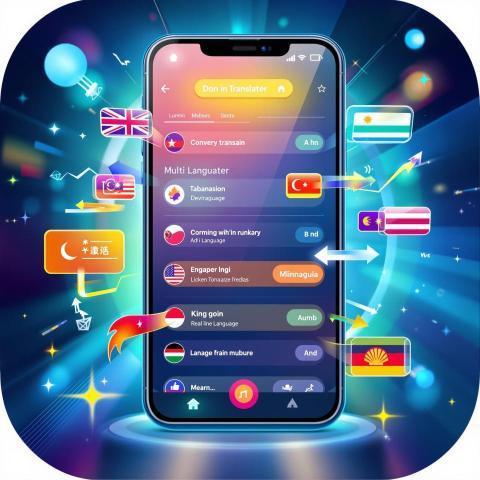 A dynamic illustration of a translator app converting text between multiple languages, with colorful icons and flags representing global communication.