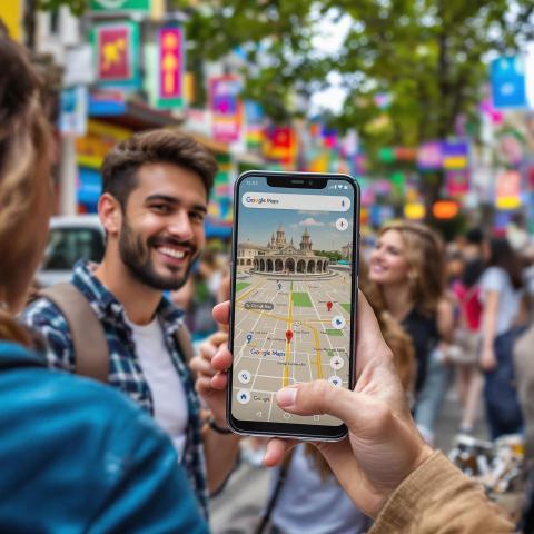 A group of friends using Google Maps on a smartphone to navigate through a bustling city, laughing and pointing at landmarks.