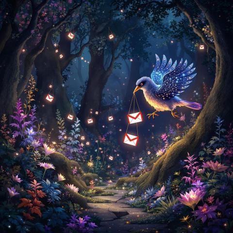 A whimsical scene where a magical bird delivers envelopes with glowing Gmail icons, flying through an enchanted forest.