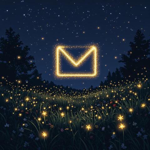 A dreamy night scene where glowing fireflies form the Gmail logo as they dance above a quiet meadow.