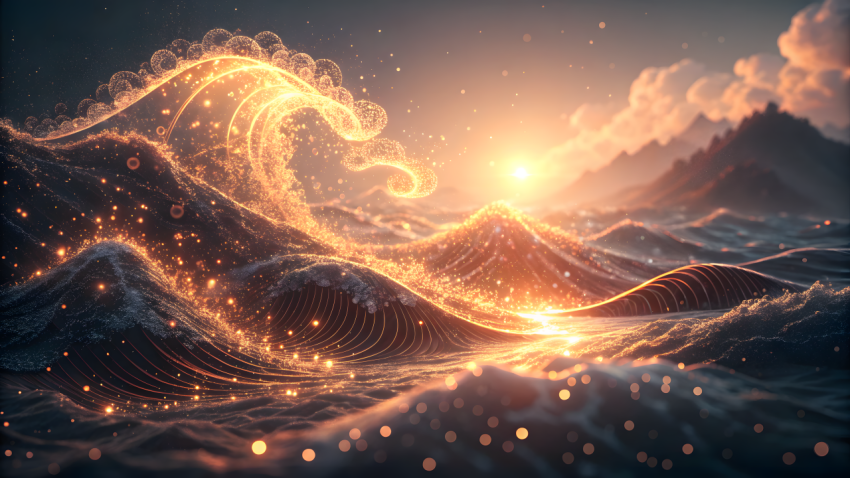 This breathtaking digital artwork captures a glowing ocean wave illuminated by the soft light of a sunset. The crest of the wave is laced with sparkling bioluminescent particles that glimmer in shades of gold, pink, and turquoise. A dreamy blend of vibrant color and motion, the scene evokes tranquility and wonder, making it ideal for themes of nature, fantasy, peace, and the sublime power of the sea. With a cinematic depth of field and surreal lighting effects, this image is perfect for use in creative projects, album covers, travel blogs, calming apps, wallpapers, and inspirational visuals.