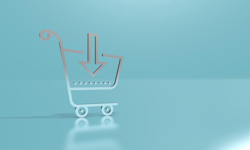 Outline icon of a supermarket trolley with an arrow pointing down. 3D illustration, 3D rendering.
