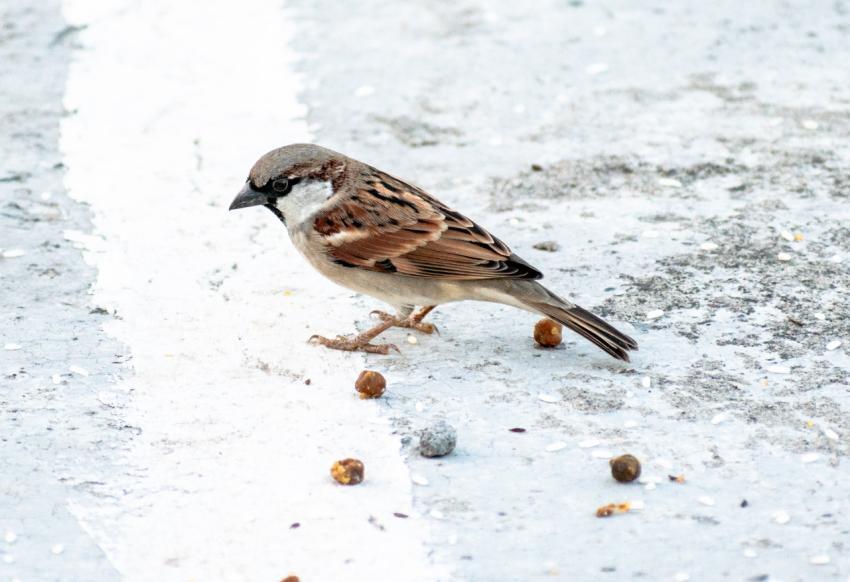 Male House Sparrows are brightly colored birds with gray heads, white cheeks, a black bib, and rufous neck.
