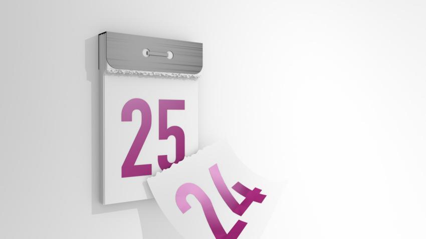 3d rendering of a minimalistic tear-off calendar. 3d illustration of changing days from 24 to 25. Falling page of the past day.