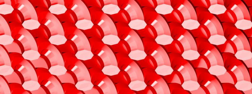 Red octagonal semicircles create an abstract wave with a metallic sheen. 3D illustration, 3D rendering.