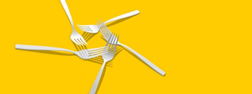 Fork on a yellow background. Forks for the design of a restaurant, cafe, pizzeria. Minimalistic kitchen fork design for advertising purposes