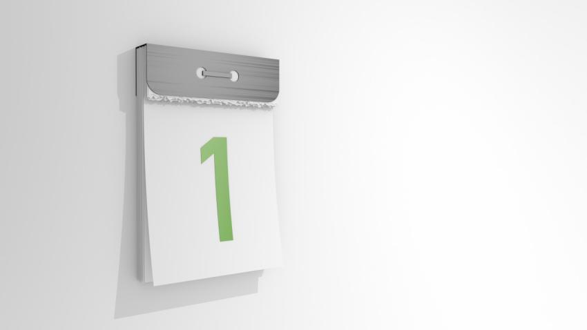 Tear-off calendar with number 1. Stylish 3d rendering of the first date. 3d illustration on white background day one.