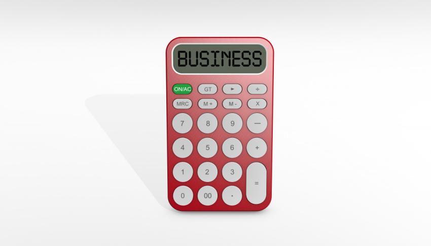 Red stylish calculator with round buttons and the inscription business on the screen on a white background. 3d rendering, 3d illustration.