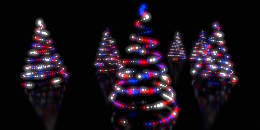 Christmas trees made from red, blue and white glowing balls on a black background. 3d rendering, 3d illustration.