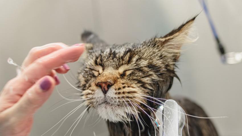 Maine Coon cat bathing with shower at grooming salon by professional groomer