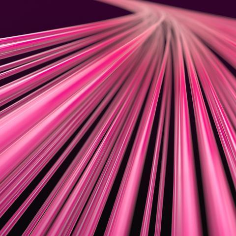 Abstract background with many pink lines or wires extending into perspective and blurring against a dark purple background.