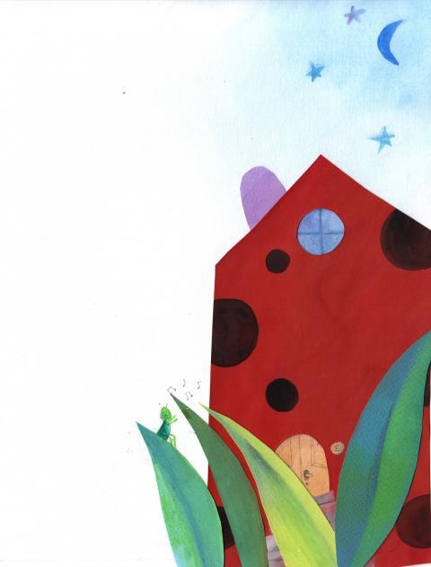 an illustration in collage, watercolor and crayons of a ladybug`s house and a cricket singing on a grass blade in front