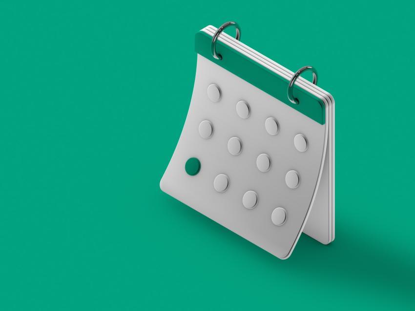 Stylish 3d calendar on a green background. Minimalistic design. 3D illustration, 3D rendering.