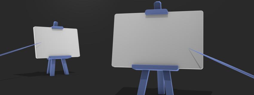 Two white blank presentation boards on a dark gray background with a pointer for any information. Stylish minimalistic render
