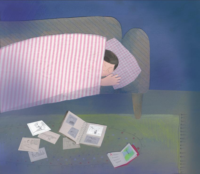 illustration in collage, watercolor and crayons of a girl sleeping on a sofa and photo albums on the floor