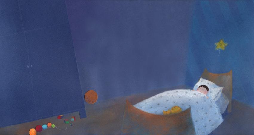 illustration in collage, watercolor and crayons of a boy sleeping in his room with a cat