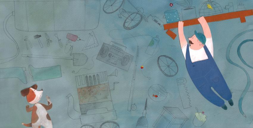 illustration in collage, watercolor and crayons of a handy man in a messy garage with a dog