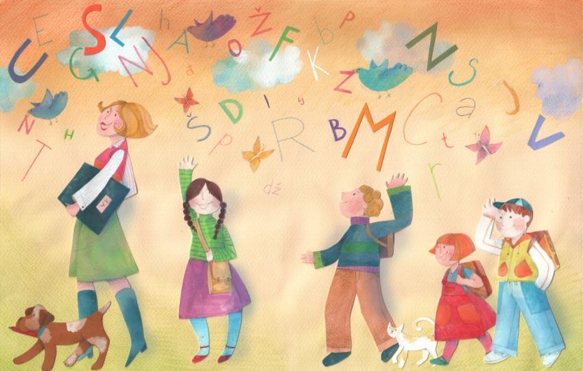 illustration in collage, watercolor and crayons of school children, teacher and letters
