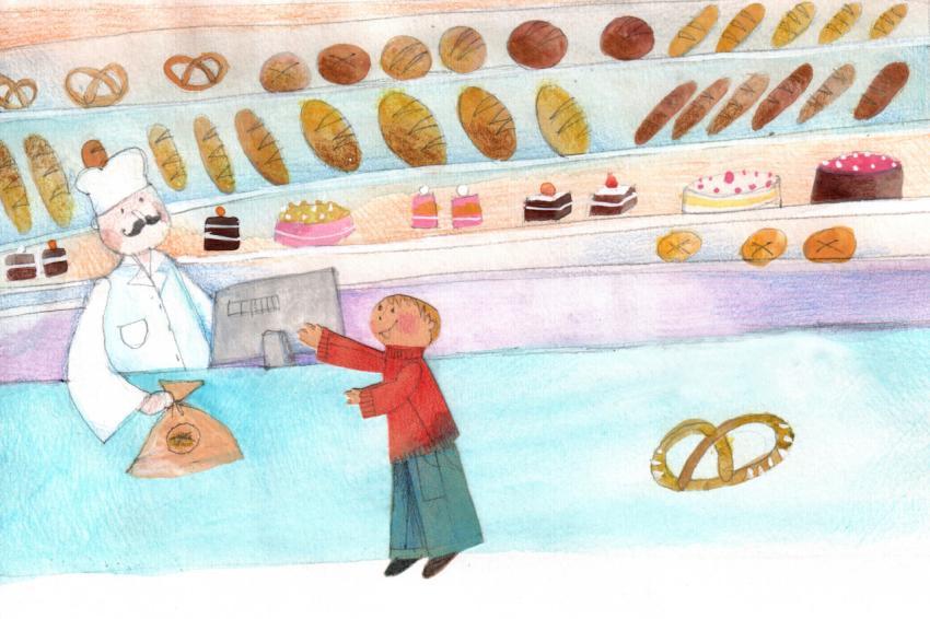 illustration in collage, watercolor and crayons of a boy shopping in a bakery