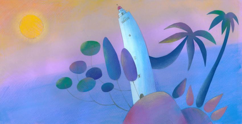 illustration in collage, watercolor and crayons of a colorful island with lighthouse in the sunset