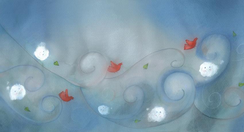 illustration in collage, watercolor and crayons of little white clouds and red birds in the autumn wind