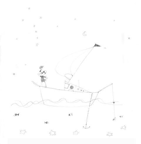 illustration in pencil of a sailor with his sail boat on a sea in a starry night
