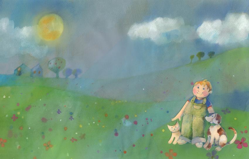 illustration in collage, watercolor and crayons of boy with his pets on a spring colorful meadow