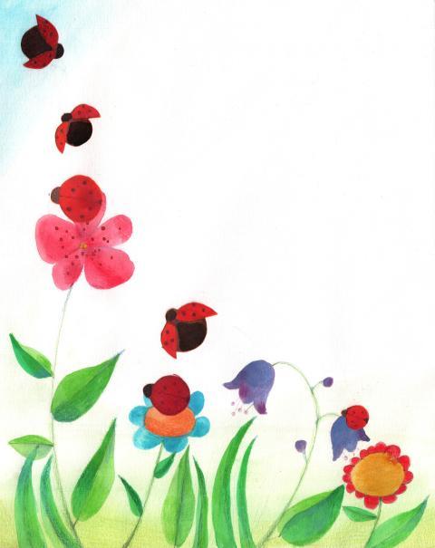 illustration in watercolor and crayons of various colorful flowers with ladybugs