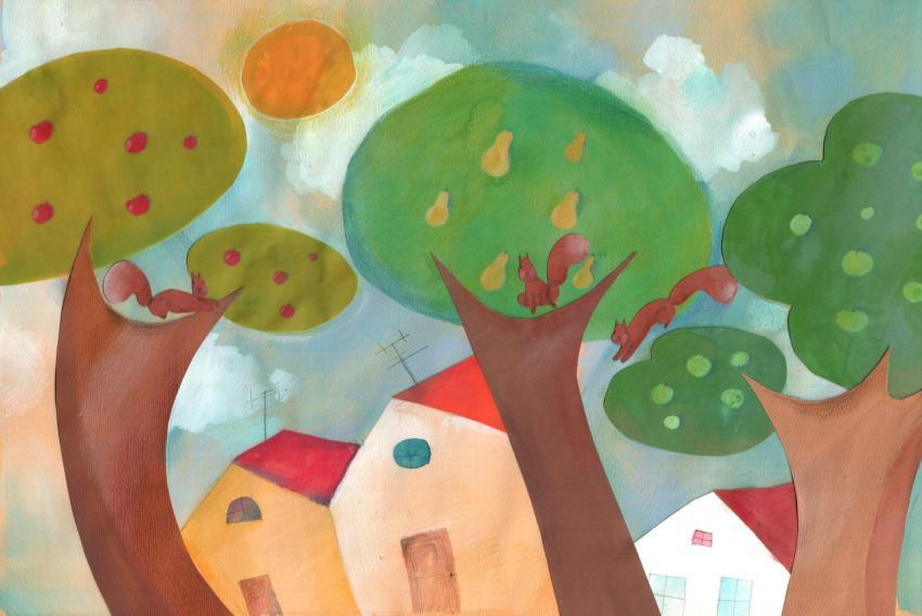 illustration in watercolor and crayons of colorful houses and trees with squirrels