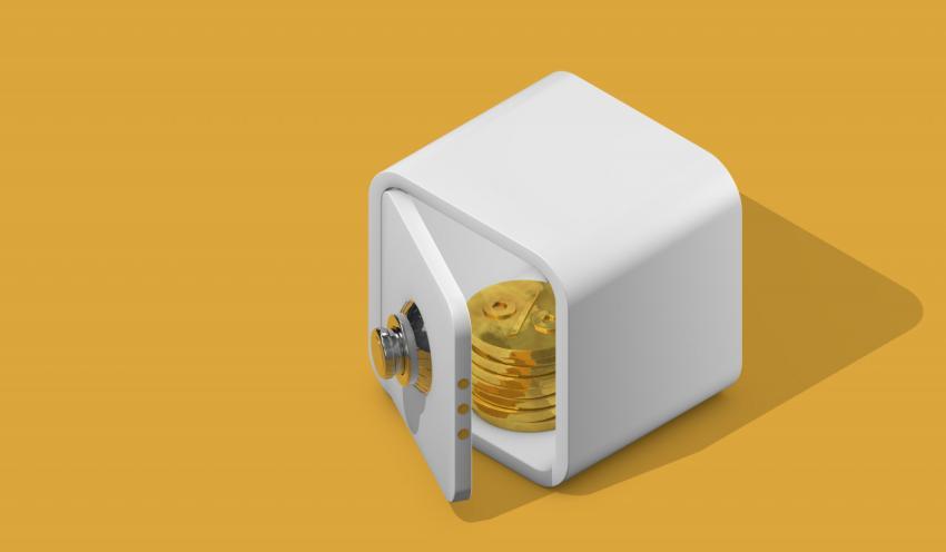 Open safe on a yellow background with coins spilling out. The accumulation of interest