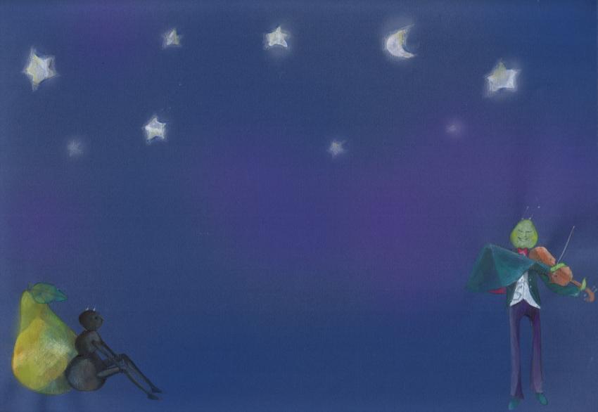 illustration in watercolor and crayons of cricket playing violin and ant listening by a pear in a starry night