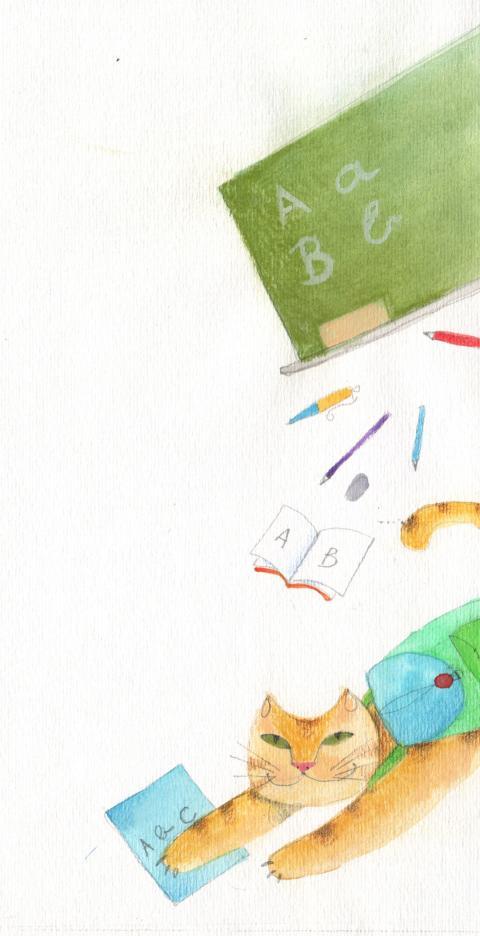 illustration in watercolor and crayons of cat with a school bag and school supplies in the classroom