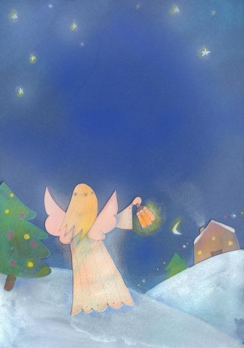illustration in collage, watercolor and crayons of angel approaching a village in a starry winter night