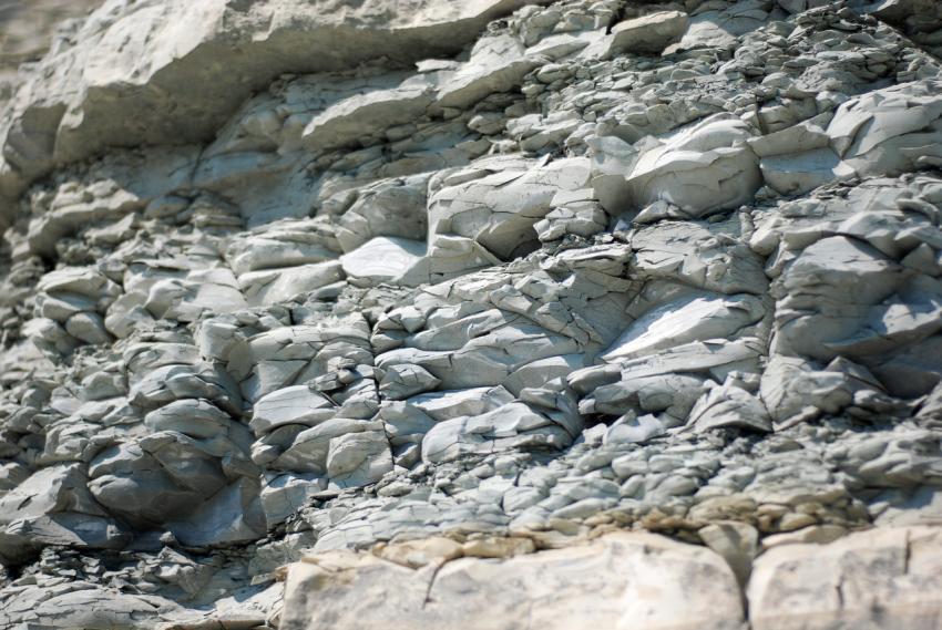 Texture of an old gray wall surface with deep cracks and tattered green paint
