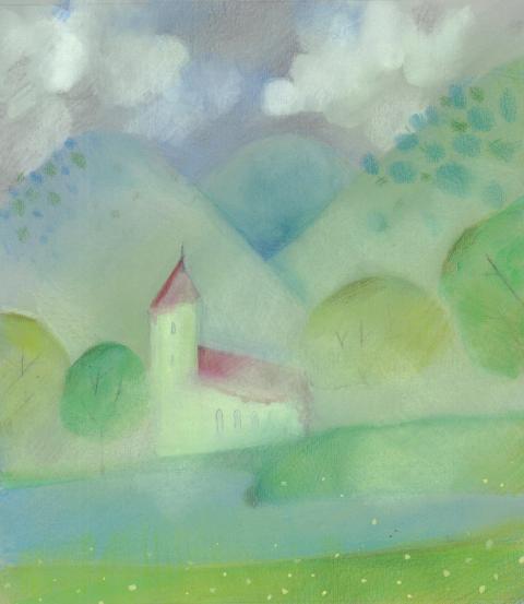 landscape nature church summer green sunny clear lake hills trees clouds colorful bright illustration watercolor crayons fresh beautifulSimilar Photos