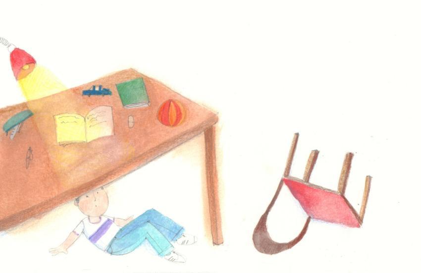 illustration in watercolor and crayons of boy hiding under the desk
