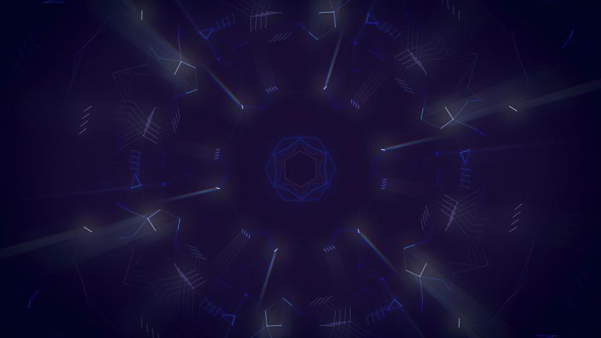 This image features thin glowing lines that create a kaleidoscope pattern. The dark blue background provides a striking contrast to the bright lines. Some of the lines are intersected by long beams of light, adding a dynamic touch to the image. The overall effect is mesmerizing, evocative of the beauty of light refracted through a prism. The colors and lines give an impression of movement and flow. The image is perfect for any project related to abstract art, technology, or futuristic designs. It can be used as background image for a website, a presentation on the latest developments in physics or cosmology, advertising.