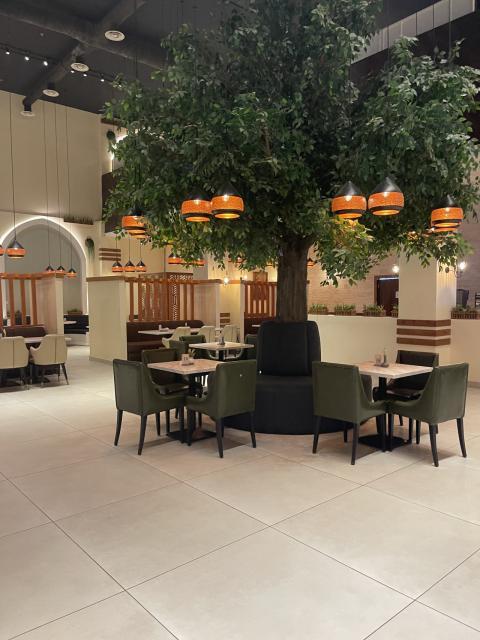 Mock up modern living room interior design with sofa, dining room with table and chairs. Open plan interior with empty picture. 3d render