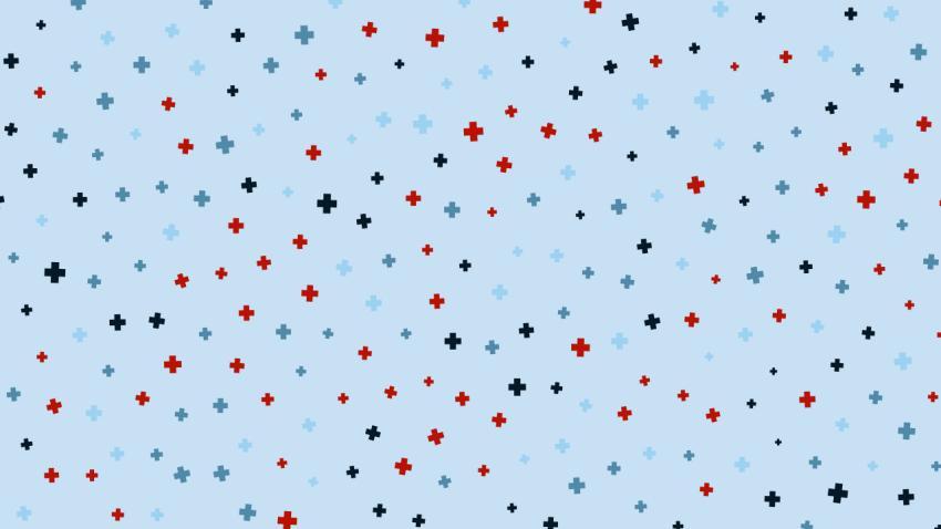 Red-blue pluses are randomly arranged on a light blue background. Illustration.