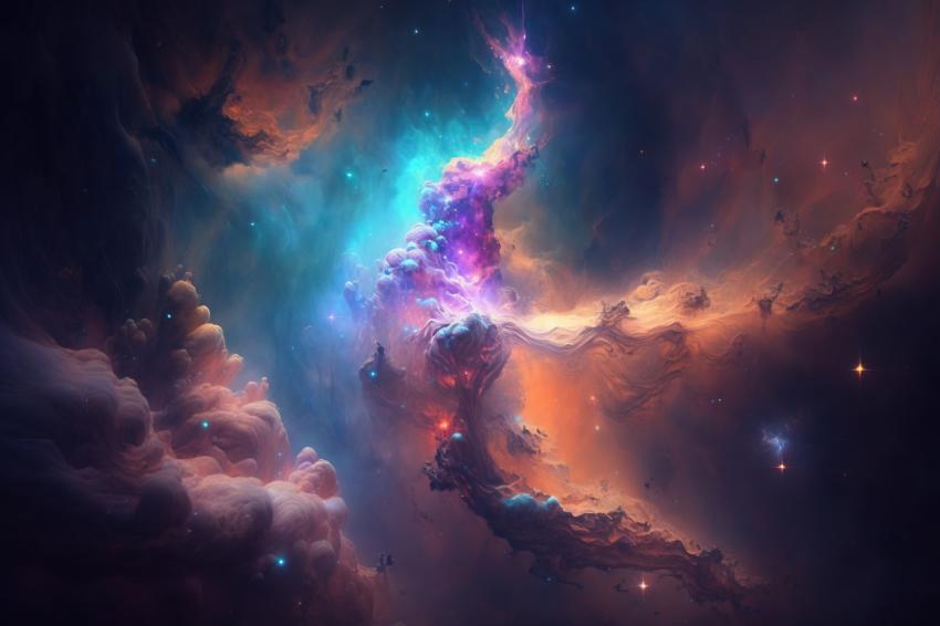 This breathtaking illustration depicts a magnificent nebula, swirling with vivid colors and mesmerizing patterns. The stars glimmer like diamonds, twinkling against the rich tapestry of deep blues, purples, pinks, and oranges. The intricate details and vibrant hues create a truly stunning display, as if the artwork is alive with the energy and power of the cosmos