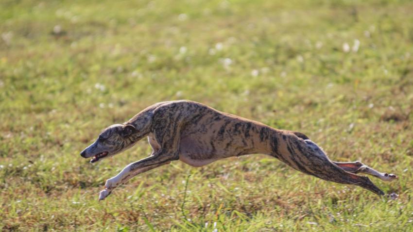 Dog running in green field and chasing lure at full speed on coursing competition straight into camera