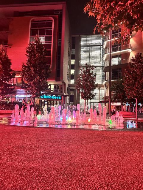 building, fountain, street, evening, red, shop windows, facade