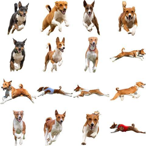 Basenji dog collage running catching hunting straight on camera isolated on white background at full speed on competition