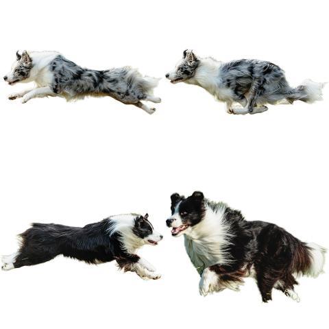 Border Collie dog collage running catching hunting straight on camera isolated on white background at full speed on competition