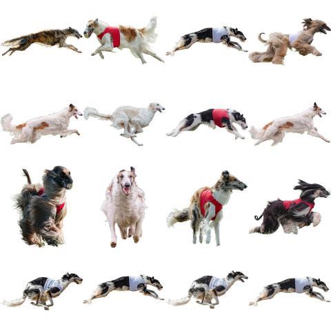 Borzoi dog collage running catching hunting straight on camera isolated on white background at full speed on competition