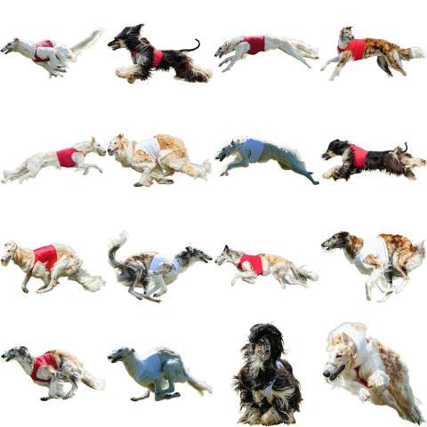 Borzoi dog collage running catching hunting straight on camera isolated on white background at full speed on competition