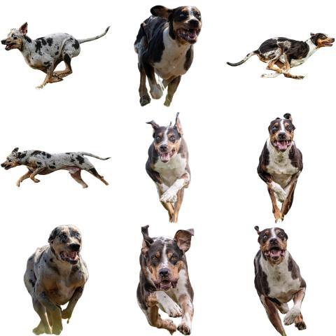 Catahoula Leopard dog collage running catching hunting straight on camera isolated on white background at full speed on competition