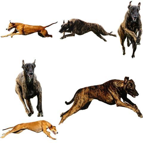 Greyhound dog collage running catching hunting straight on camera isolated on white background at full speed on competition