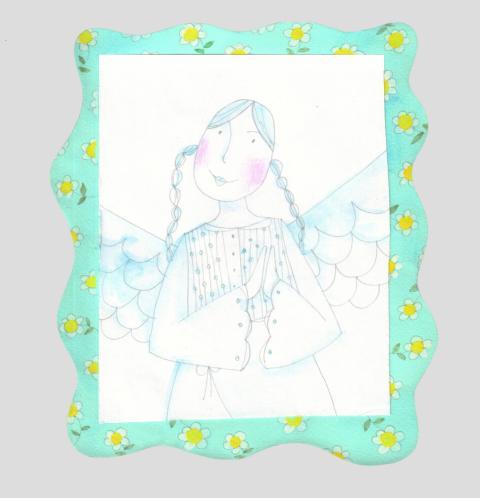 illustration in collage, watercolor and crayons of an angel in a picture frame